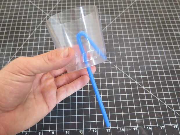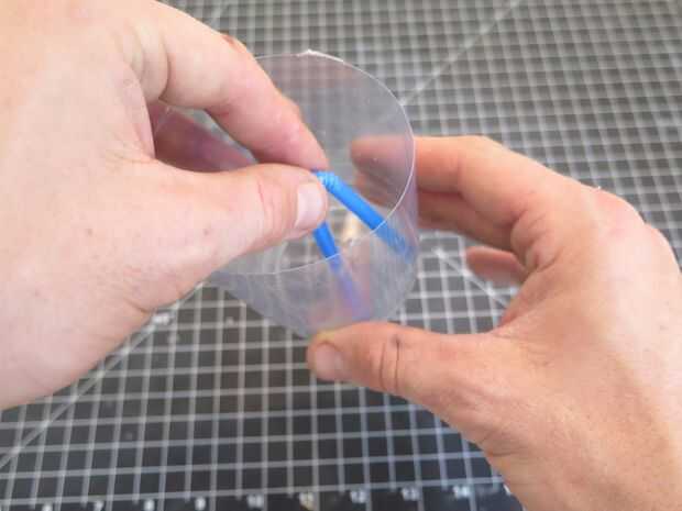 Inserte su paja para que la cabeza de su paja flexi es dentro de la taza. Deslizarse hacia abajo para que el extremo de la pajilla es tan cerca de la parte inferior de la Copa como sea posible. Si usted está teniendo un momento difícil conseguir la paja a través del orificio que hiciste, siempre puede utilizar la paja método plegable (en la segunda foto) para caber a través de.