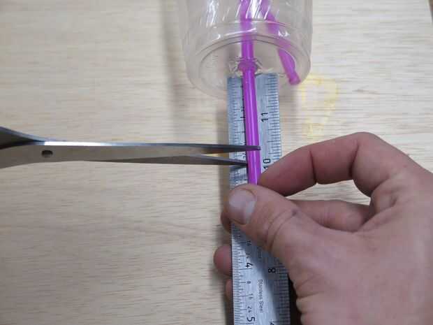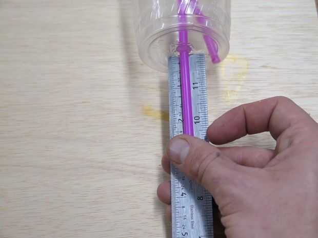 Cortar la parte inferior de los sifones si quieres ahorrar un poco de espacio vertical y medir una pieza de madera que puede caber los tres. Córtela a un tamaño que funciona para usted. Marcar donde quieres poner cada taza, para que pueda fluir de uno en otro.