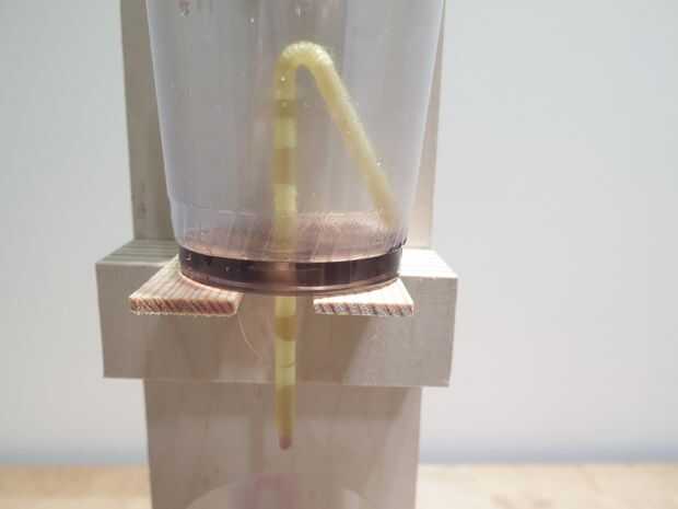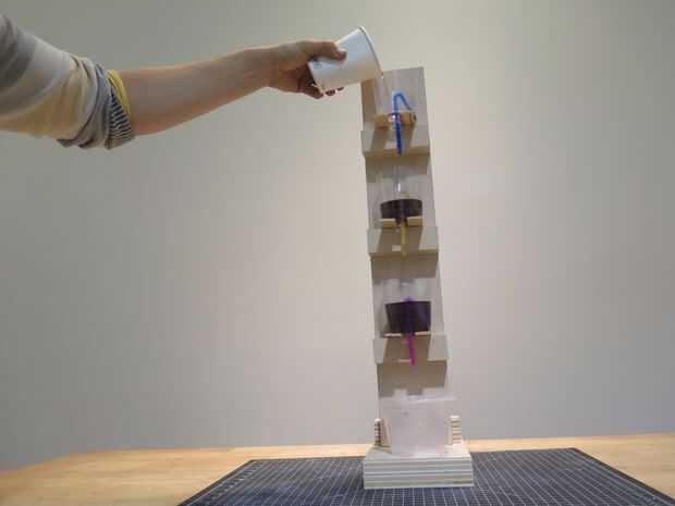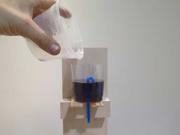 Coloque sus sifones en una pila con una taza de colección en la parte inferior. Color agua y verter en el sifón superior. Usted encontrará que nada drena hacia fuera hasta que el nivel alcance sobre el bucle de la paja. Desde allí verter un poco de agua extra y ver como la reacción en cadena de la vida.