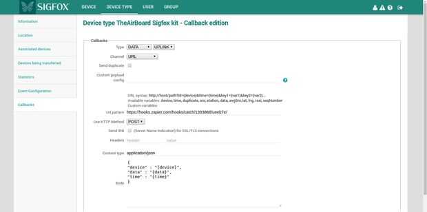 En el medio, usted necesitará crear una devolución de llamada en el Sigfox Backend. Para hacer eso, ir a "Tipo de dispositivo", haga clic en el tipo de dispositivo y en el menú de la izquierda, verás un artículo llamado "las devoluciones de llamada". Haga clic ahora en nuevo en la esquina superior derecha y llenar los datos como se muestra en la imagen. Asegúrese de reemplazar la url por la url proporcionada por Zapier WebHook.