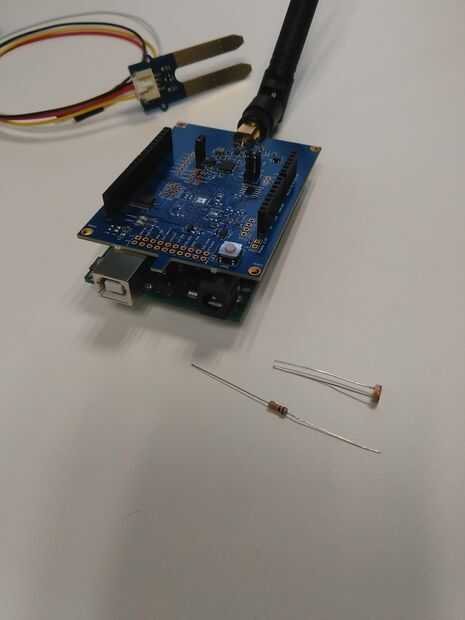 Lo que necesitamos es obtener la humedad del suelo, la luminosidad y la temperatura. El sensor de temperatura ya cuenta con el escudo ATMEL, así sólo tenemos que añadir la resistencia de la fotocélula (para obtener la luminosidad) y el sensor de humedad.