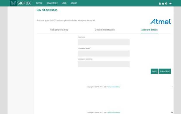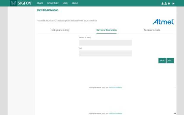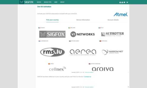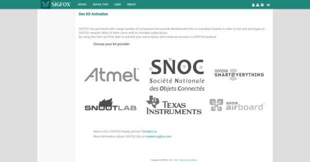 Para activar el kit de desarrollo, vaya a https://backend.sigfox.com/activate y elegir su proveedor.