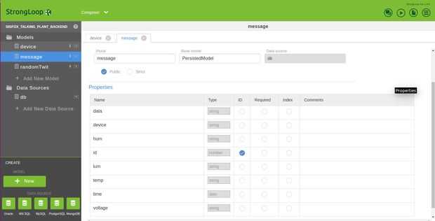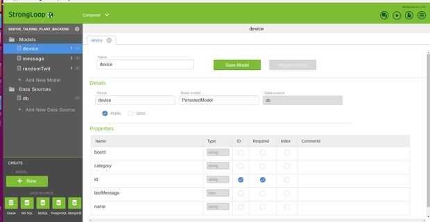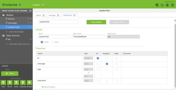 Luego ir al compositor y añadir un nuevo modelo "dispositivo". Llenar las propiedades como se muestra en la imagen. Repetir este proceso para crear el mensaje (randomTwit modelos y eventualmente, si desea personalizar a los twits).