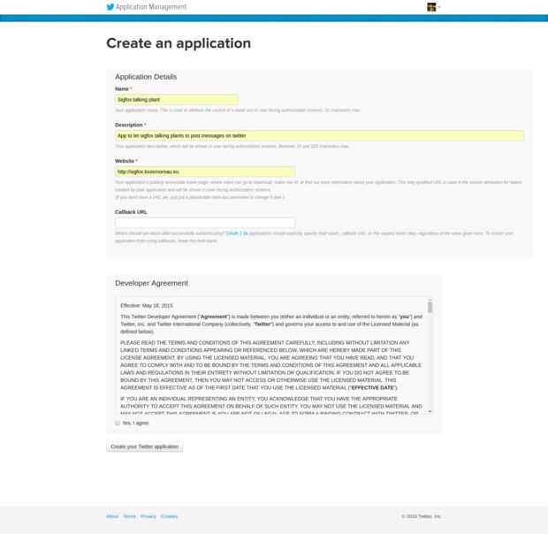 Ir a https://apps.twitter.com/ y crear una aplicación.