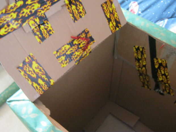 Cómo lo hicimos:Cartón y montones y montones de cinta! Cada uno comenzamos con una caja grande de cartón y pegadas sobre cartulina más para conseguir la forma correcta, tamaño y detalles. Rebanó la ventanas en 3 lados, aerosol pintado, entonces comen