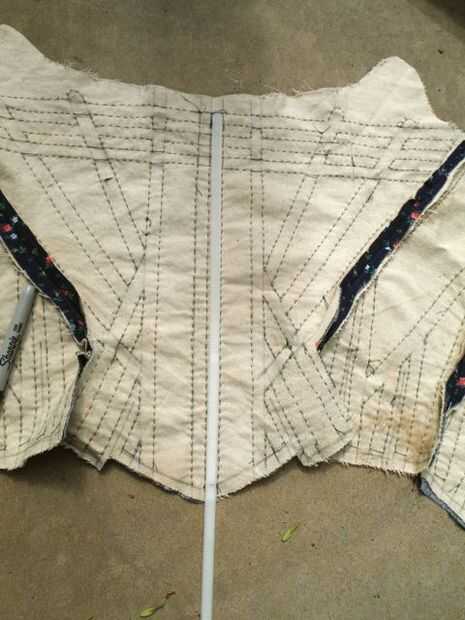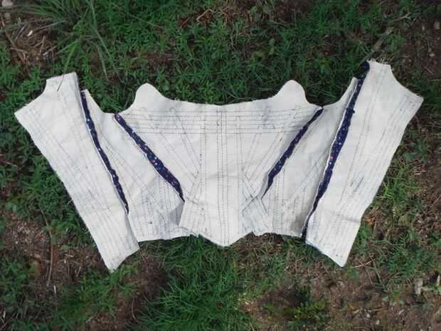 Los canales están formados por coser la entretela a la tela. Había bosquejado en los canales de deshuesado de la parte posterior de la entretela con un lápiz y luego corrió un punto corriente abajo de cada línea para hacer un canal entre la tela de interfaz y principales. Deshuesado de canal de colocación era realmente algo arbitrario. La única estipulación basada en ejemplos históricos es que los huesos dentro de unos cuarenta y cinco grados de la vertical. Basado en problemas que tuve con mi primera estancia, me aseguré de dar los huesos que se extienden en las lengüetas para arriba más allá de la parte superior de las pestañas. De lo contrario dobla hacia fuera y eran incómodas y parecía terribles.