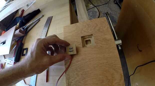 Las placas de cara para los USB plug-ins se realizan con un poco de embutido y plantillas que hice utilizando madera contrachapada y algunas imprimir con mi impresora 3D. Una vez que todas las inserciones se recortan (más extras por si acaso) cortan gratis usando la sierra. Cortar las inserciones de la misma pieza de madera que las piernas fueron cortadas de manera coincidirán con el color y el grano.