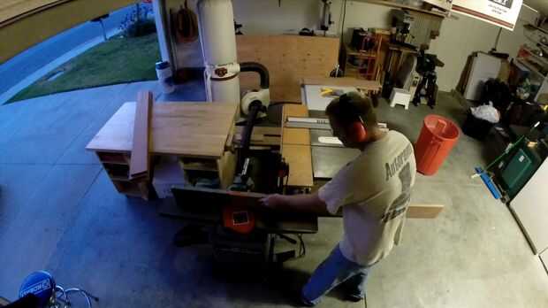 Tomar el borde recto y lugar contra el tope-guía de la mesa vio y cortar a la anchura final + un poco para uno último pasen en la ensambladora (mi poquito es 1/32").