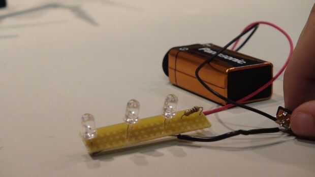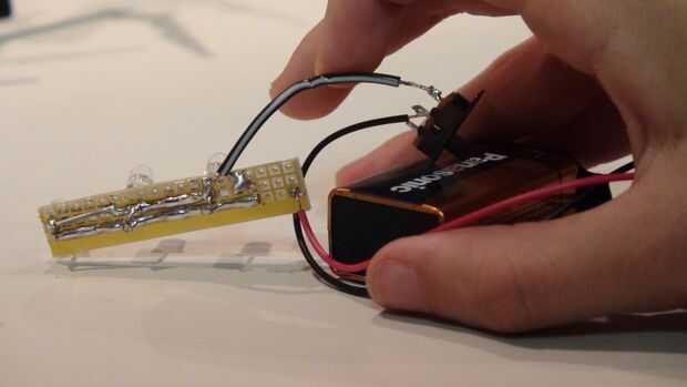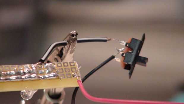 Cortar un trozo de alambre y al final de la tira. Soldadura en el lado negativo del circuito y también suelde el cable negativo de la abrazadera de la batería al interruptor. Entonces le solde el cable positivo del clip de la batería hacia el lado positivo del circuito.