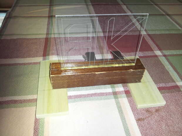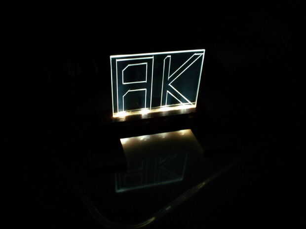 para mi buen amigo salía para la Universidad y quería hacerle un regalo personalizado.  Desafortunadamente para mí, ella ya tenía todo lo que quería, así que había que ser creativo.  He decidido hacer un glowng acrílico LED signo con sus iniciales en él.  Primero cortar el acrílico y luego había grabado sus iniciales en él.  Luego, corté un surco en un bloque de madera, con LED luminoso para arriba a través de él.  El acrílico fue pegado en el surco, así que ahora, su resplandor iniciales cuando se encienden los LEDs.  Se ejecuta en una batería de 9 voltios.