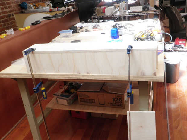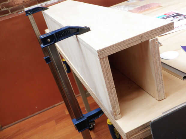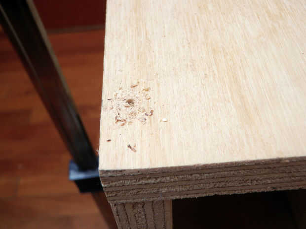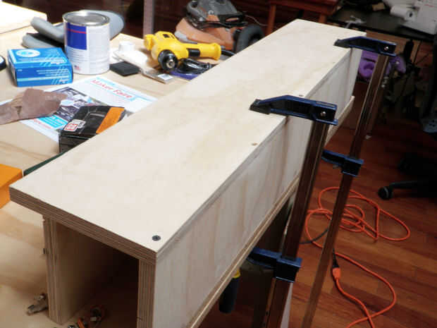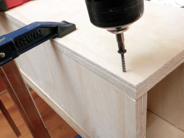 Pare a un tablero de 36 "x 6" que es el canal más cercano a la mesa y frente hacia adentro. Coloque la Junta de 36 "x 7" en la parte superior, que se unen en ángulo recto. Puede utilizar la segunda junta de 36 "x 6" para guardar el montante por el momento. Perforar unos agujeros y luego fijarlas con tornillos para madera.