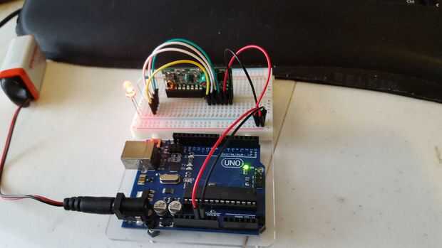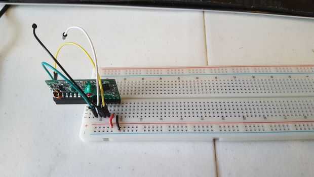 Para probar el control remoto, simplemente agregué a un protoboard y conectado los cables de corriente. Entonces corrí un alambre de D0, D1, D2 y D3 a un solo resistor. El otro extremo de la resistencia fue el ánodo del LED mientras que el cátodo del LED a tierra. Ahora, si pulsa un botón del mando a distancia, verá la luz venga a. Repita para los cuatro botones. Esto nos dirá que el mando y el receptor están funcionando correctamente en todos los cuatro canales. Ahora que se hace, puede desarma todo otra vez.