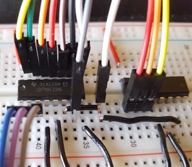 Ahora, conectar en las salidas Y0-Y7 de la 238, obtienes la siguiente de la formación de cabezas de la Hidra... La imagen muestra cómo salidas mira cuando tienes las 238 líneas conectadas y listo para ir. Usar cables de colores para hacer la vida más fácil. Ahora necesitará conectar las salidas Y0-Y7 para los 138 chips así. En la fotografía, estoy mostrando solo el 238 chip con Y0-Y7 pines salidas conectados.