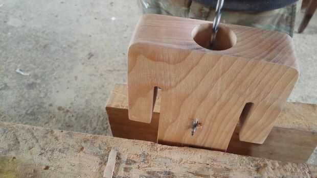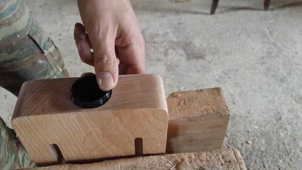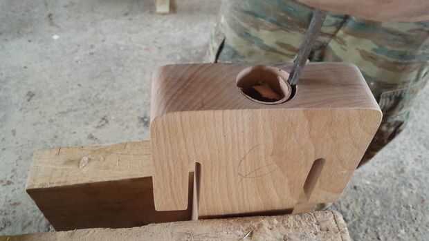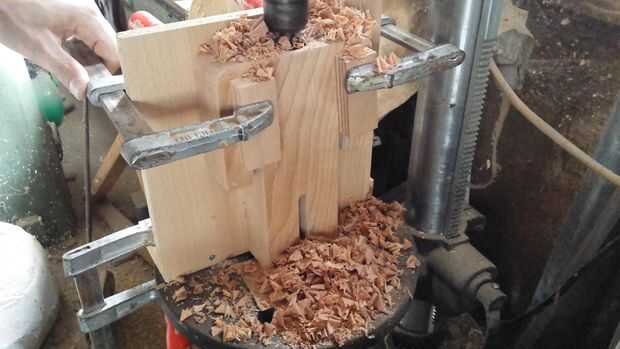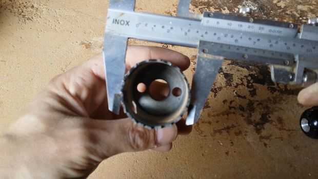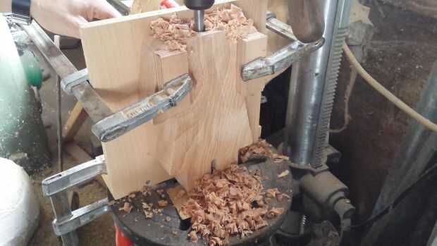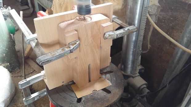 La mejor forma de ajustar las tomas es utilizar una pieza Forstner de 40mm. Por desgracia no tengo uno, pero tenía un agujero de 40mm Sierra. Usé esto para hacer los agujeros, y luego utilicé una pieza Forstner de 35mm para eliminar tanto material como pude. Luego limpiar los agujeros con un cincel de 6mm