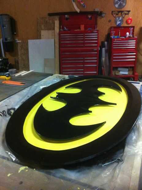 Lijar hasta grano 320. La frontera y forro amarillo es una sola pieza el se enrosca en los postes y el batman logo es colgado usando clip colgantes (4 en total Valle lee). Si elige, yo también elevada la frontera y muestra por 3/4" para darle profundidad y para las tiras de"glow in the dark"pegué en la parte trasera. El niño fue balístico cuando apagué las luces!!!!!!