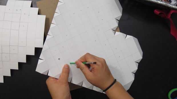 Dependiendo de la cantidad de luces que tiene en su paquete, perfore los agujeros en consecuencia. Mina llegó con 20 luces encadenadas así marcó 20 puntos por mi forma de la base. Hice un pequeño agujero con una tachuela antes de rajar con una X con mi cuchillo x-acto y empujando un pincel a través del orificio.