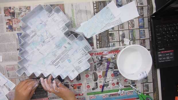 Mezcle el pegamento de su Elmer con agua hasta que quede una consistencia lechosa. Tirar tus retazos de periódico y dejarlos remojar, esto hace fácil trabajar con. Exprima el exceso de agua y empezar a pegar sobre su forma. Deje que se seque durante la noche.
