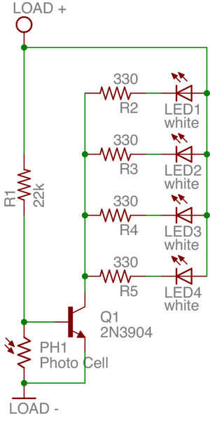 He creado un circuito de transistor simple controlado para activar o desactivar los LEDs basados en la luz detectada por la célula fotoeléctrica. Había intentado utilizar el panel solar sí mismo como la fuente para la detección de luz/oscuridad, pero el circuito de charing causó gran tensión ondas como el sorteo van y vienen. Colocaron en una fuente de detección de luz independiente para mantener las cosas simples. Diseñado, cada LED dibuja acerca de 5mA a 3.7V, el transistor puede soportar unos 10 LEDs si es necesario.