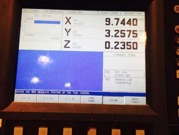 • Elija la esquina inferior izquierda, el origen del acrílico. Cero cada eje colocando la fresa contra el borde izquierdo del acrílico. Presione la referencia y luego presione X = 0. A continuación pulse usar. Ya que queremos que el origen sea el centro de la fresa, mueva la fresa sobre el acrílico en la dirección x positiva sobre la longitud del radio de su buscador de borde.