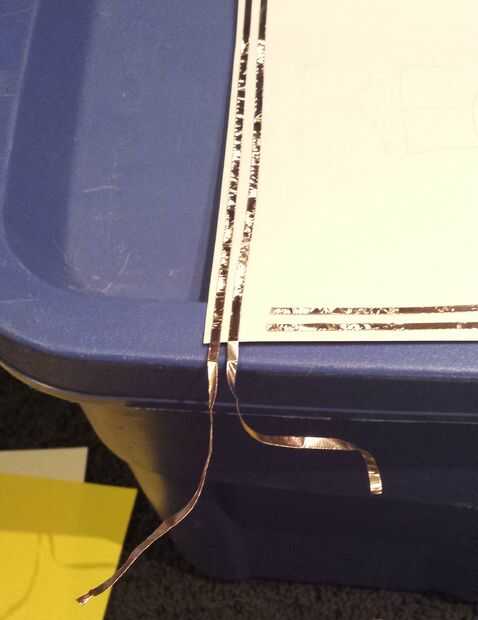 ¿Recuerde que las líneas de la plantilla que se ejecutan todo el camino hasta el borde de la página? Pegar la cinta de cobre hacia abajo a lo largo de las líneas, dejando sobre un pedazo de 2 pulgadas de largo que sobresale en cada extremo, como se muestra arriba.
