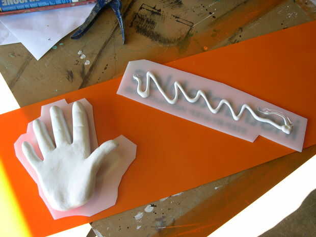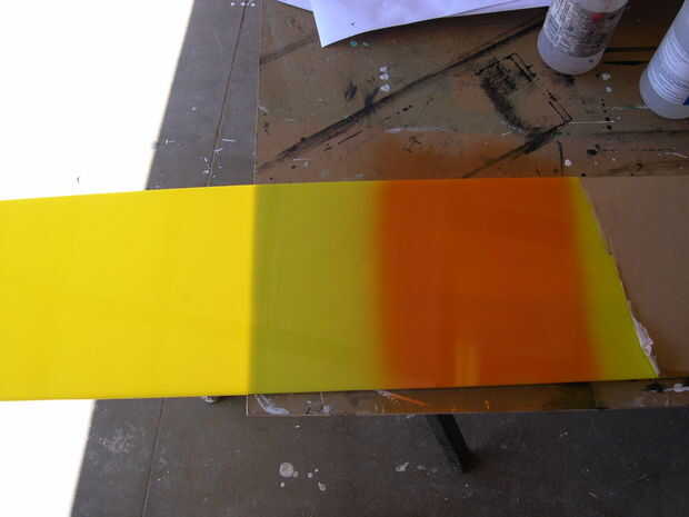 No tengo cualquier acrílico naranja para el fondo así que pinté algunos acrílico amarillo naranja con krylon Bombas de aerosol. Luego coloca los trozos más pequeños de acrílico y usa silicon para pegar hacia abajo. Luego pegué la mano tallada para acabar con el signo.