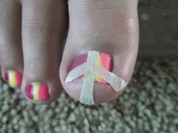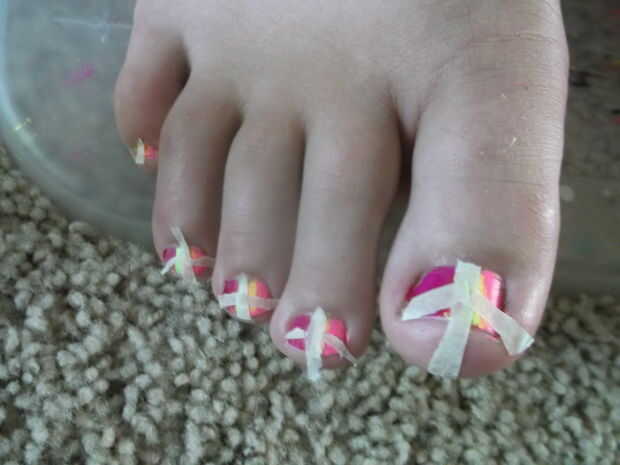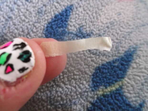 Con las tijeras (créeme, te necesita...), cortar tiras de cinta y organizarlos en un patrón de signo de la paz: una tira el centro y dos a los lados! Salir de extra en los lados por lo que la cinta es fácil de pelar.