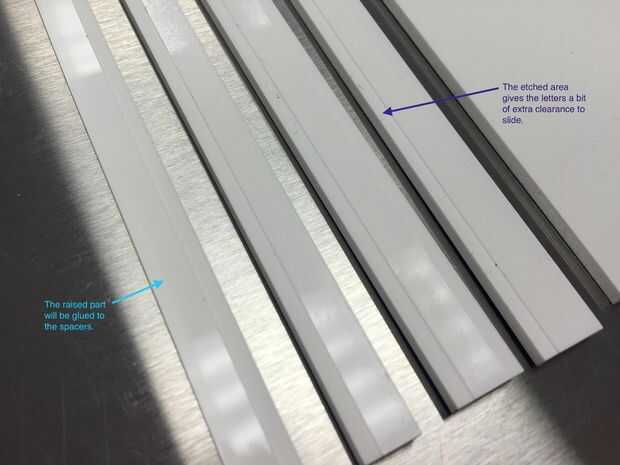 Para asegurarse de que las letras pueden deslizarse y salir fácilmente, apliqué un etch a los bordes de los rieles que cubren las letras.