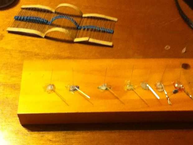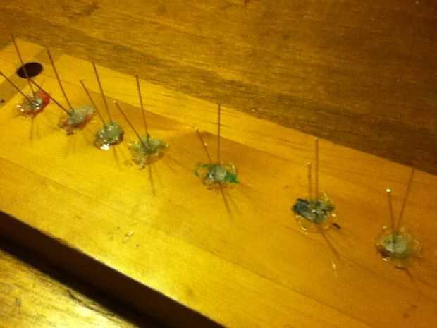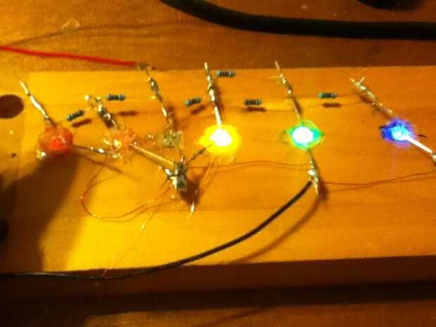 Tomar su lugar en hay agujeros que uso una pistola de pegamento caliente para mantenerlos en su lugar y LEDs. Si usted quiere hacer lo que hizo y seguir los colores en el álbum como yo lo hice el cableado será un poco diferente. En primer lugar independientemente de cómo puedes hacerlo, hacerlo en paralelo. Eso significa que todos los negativos están conectados juntos y todos los aspectos positivos están conectados juntos. También poner una resistencia entre cada uno llevado en las patas positivas. Ahora esto es donde ocurren los varients. Si haces todo el color de un LED que tu bien ir, pero si utilizas la forma de arco iris que hice debe practicar. En primer lugar off permítame decir que no comprender por qué esto cambia intensidades de color pero lo hace. usted querrá poner la fuente de alimentación en las piernas de LEDs verdes, y no desea ningún resistencias en los LEDs naranja o rojos para la mejor distribución. He encontrado que los colores en la parte roja del espectro no funcionan muy bien para estos signos de acrílico, a menos que utilice muchos de ellos. Prácticamente listo ahora hasta su hogar estirar tiempo!