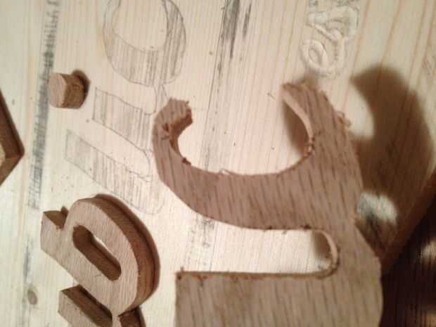 Para mi diseño, varias de las letras conectan entre sí, y resultaba más fácil hacer el interior cortes primero, y luego hacer el exterior.