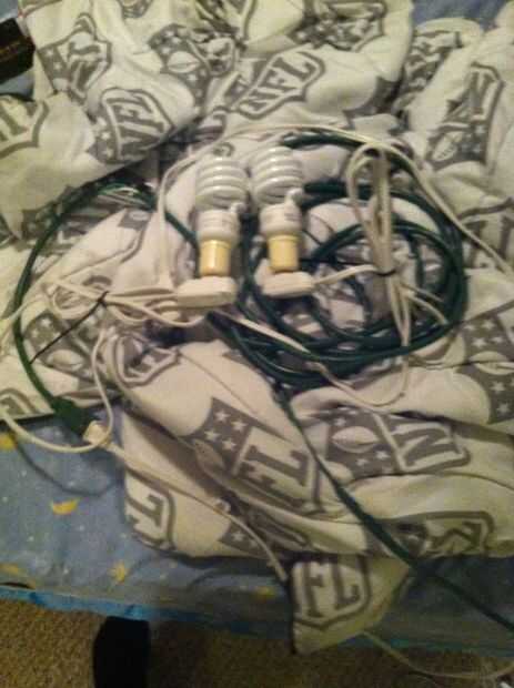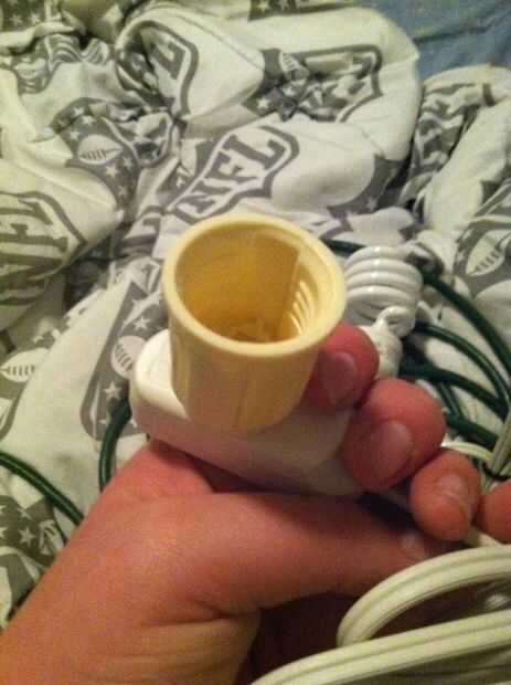 -Una tercera diferencia es en la forma en que atada con alambre. Usé dos convertidores "bombilla para toma de corriente" que he encontrado en Walmart por $.98. Me adjunto a cada uno de ellos a un cable de extensión corta y caliente-pegado en las esquinas opuestas de la caja. Las bombillas utilicé estaban simulando 100w bombillas CFL, que uso realmente solamente alrededor de 25 vatios de potencia. Cada una de las dos extensiones al cable de una extensión corta principal y luego había atado que uno a un cable de servicio pesado al aire libre/de interior 25 foor. Este es el único cable que sale de la caja (yo quería que fuera simple y fácil de utilizar). También he añadido un interruptor estándar de 4 pulgadas desde el extremo hembra del cable para trabajo pesado. Esta manera, usted puede activarlo o apagado en lugar de desenchufar y enchufar de nuevo en.