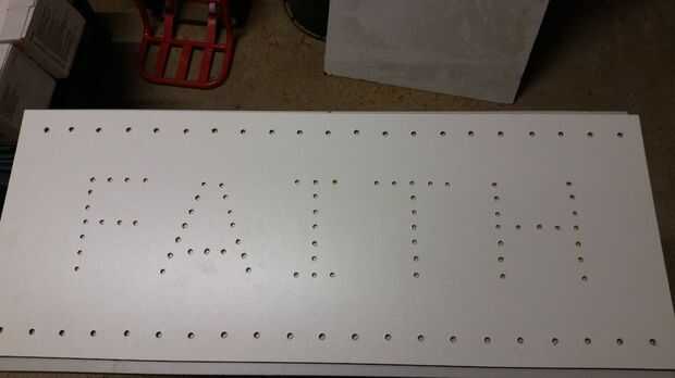 Usando las letras MDF como plantillas que luego perforé la principal hoja de MDF con todos los agujeros de 8mm necesitados. Perforé 25 agujeros de 8mm espaciados uniformemente a lo largo de la parte superior e inferior también.