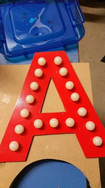 Coloqué una baya en cada agujero para ver lo que parecía. Yo desmontarse las bayas luego esterilizados cada letra con un par de capas de acrílico transparente. Entonces usando pegamento de contacto pegué las letras en su lugar.