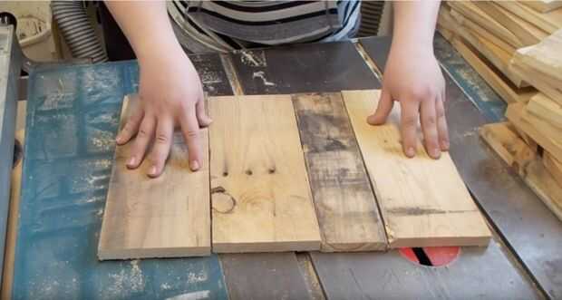 Una vez tuve mi tablas seleccionadas, arrancó los anchuras al azar hasta que me dieron una mirada que me ha gustado. Les hice la misma anchura y dejé también el borde de la plataforma original en los bordes exteriores. Algunos de los consejos eran amplios y algunos eran delgadas. Una vez más, tenga cuidado de que no cortar en un clavo. La muestra final mide 8 "x 10" o más o menos del tamaño de una hoja de papel de copia.