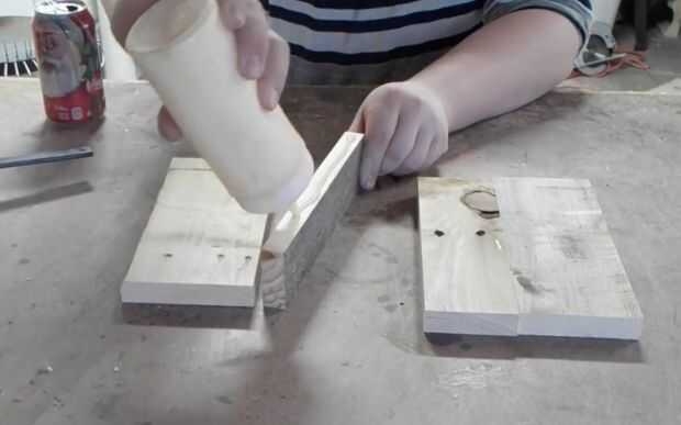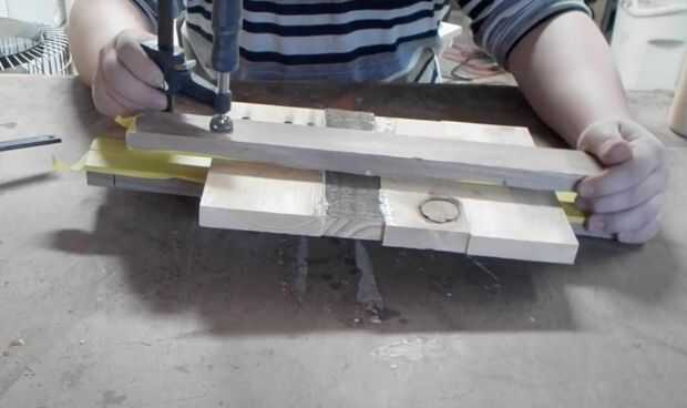 Extienda pegamento para madera Titebond II en los bordes que se reunieron otros bordes. Para asegurarse de que tienen cubiertas todas las superficies, coloqué las piezas borde a borde y se deslizó detrás de las juntas de acoplamiento y a difundir el pegamento. Cubrí dos piezas de madera con cinta adhesiva para evitar que se pegue a la madera hasta que el pegamento se seque. Estas dos piezas de madera se llaman "llamados". Me intercala las piezas de madera de la señal entre las llamadas y les fija un poco para mantener la señal plana mientras se seca. Luego he puesto tantas pinzas como puedo ajustar borde a borde en la muestra. Reprimieron estas hasta que vi una buena cantidad de squeeze-out (que es buena. Es decir, todo lo tiene cubierto con el pegamento) y luego reprimieron las llamadas firmemente. Salí de las llamadas un poco floja antes por lo que todavía podía aplicar buena presión de sujeción para las piezas de la muestra.