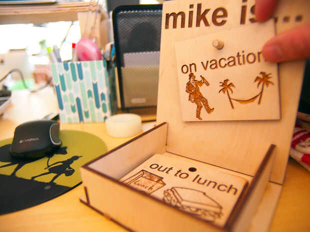 Este signo tiene 3 cartas con una ubicación diferente en cada lado y un lugar para guardar tus cartas cuando no en la clavija que muestra dónde estás. Cuando no hay ninguna señal en la clavija hay una imagen por defecto (en mi caso "causando problemas"); de esta manera el signo no está sólo ocupando espacio en mi escritorio cuando estoy allí.