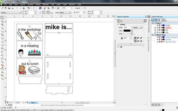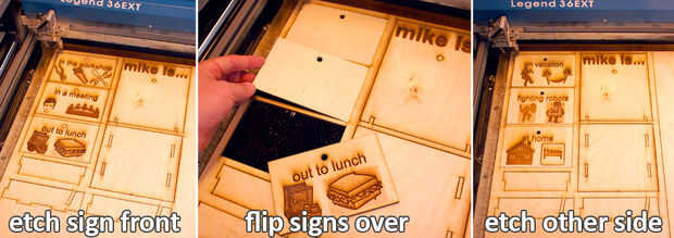 Con el dibujo del CAD cargado en el programa de corte de láser acaba de dejar en imágenes que encontré y redimensionadas para caber en mis señales. He añadido algo de texto, también. Después de la primera parte fue grabada volcó los signos, teniendo cuidado de no mover el resto de los cortes. Esto mantiene todo bien alineado para el siguiente paso.
