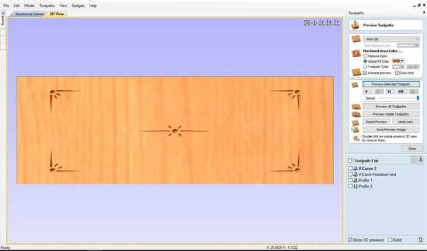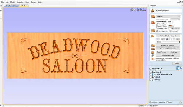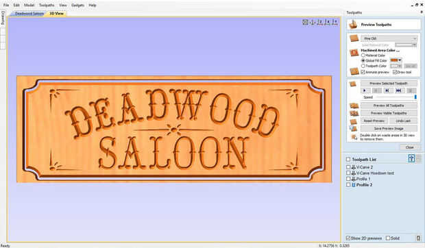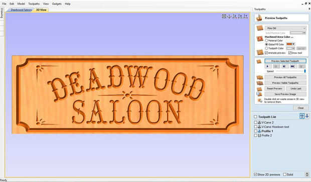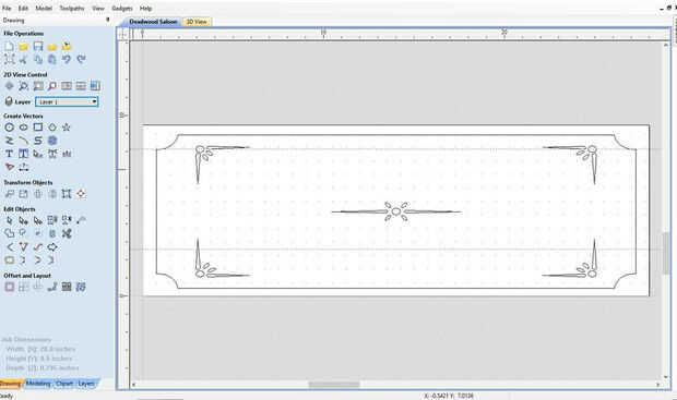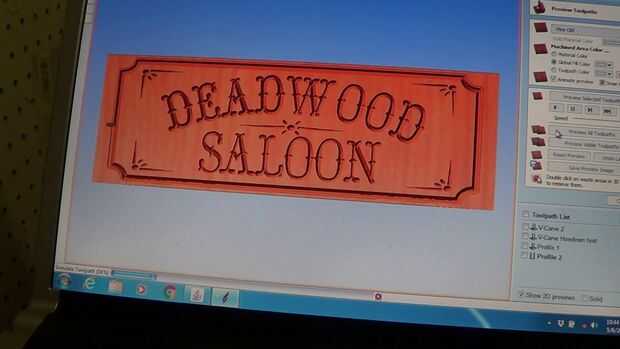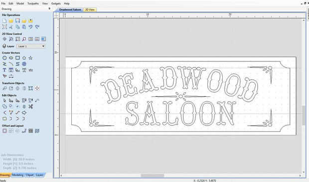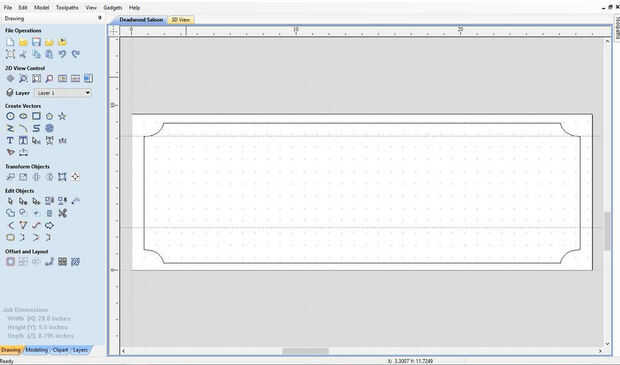 Usé Vectric Aspire a mi signo de salón de diseño. Empecé con la porción de recorte, hacer un rectángulo con las esquinas de radio interior. Luego de diseño los diseños de centro y esquina. Texto insertado del Saloon de Deadwood, utilizar letra Hoedown.