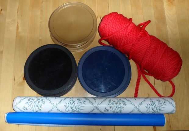 No compramos objetos nuevos para este proyecto. Para cadena, utilizamos cable de macramé comprado en la tienda. Las tapas son de latas grandes de café y nueces. Tenía el papel de contacto azul, y el papel de contacto de la hierba fue comprado en una venta de garaje. Utilizamos un tomate alguien donó al jardín para colgar el cartel de la jaula.