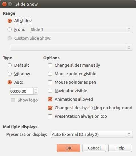 Para ello, establecer el tipo de auto y tiempo de 00:00:00. Esto es en la presentación, configuración de diapositivas. Esto lazo la presentación indefinidamente.