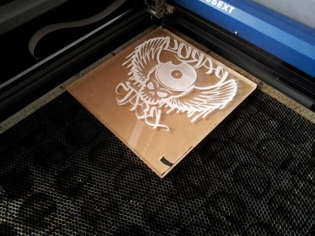 ** Olvidar el gráfico del espejo es un error común y que sin duda he hecho más de lo reconozco. Como un chequeo de mis habilidades de diseño se utiliza una máscara de poliester color verde en la parte superior de la pieza de acrílico y grabar a muy baja potencia * (5% de potencia, 100% de velocidad en un sistema de láser de 40 vatios) ajuste por consiguiente. Después estoy seguro de que el gráfico es correcto y grabado en la posición correcta, quite la máscara y grabar en la potencia para el acrílico.