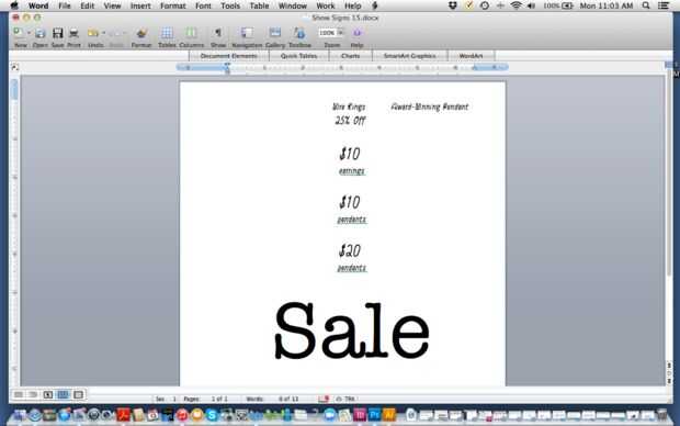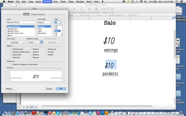 Ahora hacen cada cartelito estéticamente en su fuente elegida. Por ejemplo, venta en mayusculas no lee bien, usé sólo superior y letras minúsculas. Palabra no tiene herramientas de gran diseño, pero usted todavía puede hacer lo suficiente para hacer que sus muestras se ven bien. Puede cambiar el tamaño de las fuentes. Puede hacer las partes más importantes de una etiqueta o firmar un tamaño de letra más grande. Puede el centro o alinear tipo a mano, añadiendo espacios.