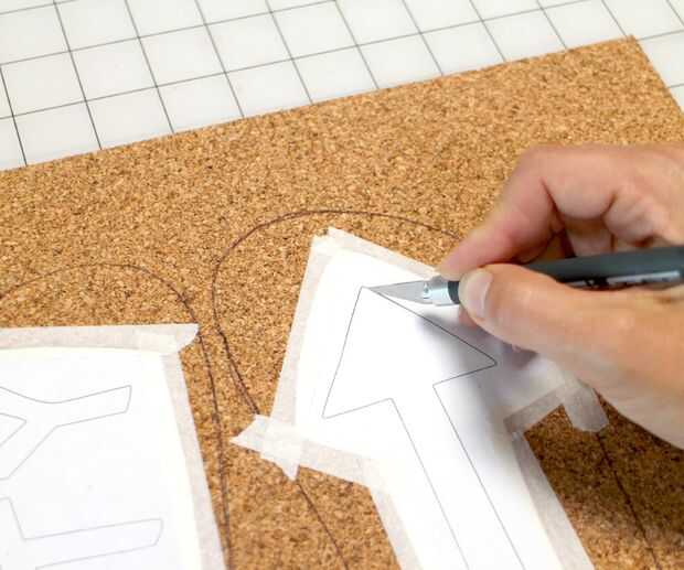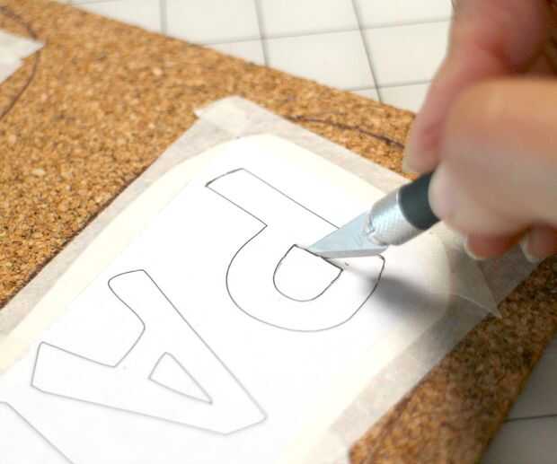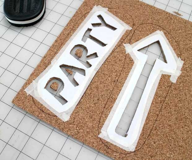 Utilizando una cuchilla afilada, corte 'Party' y la flecha. Asegúrese cuidadosamente corte minúsculo 'dentro' de letra pedacitos y apártelas para encolar en su lugar más adelante.