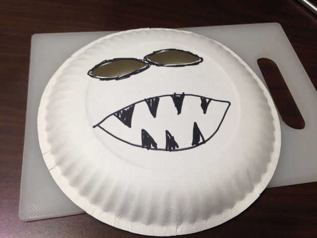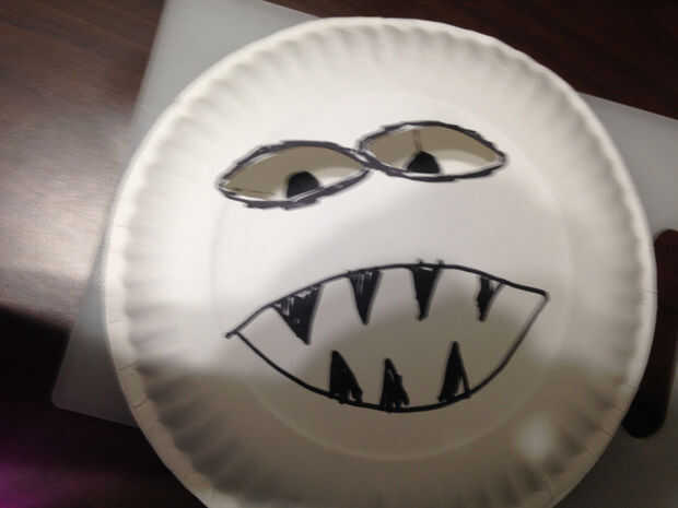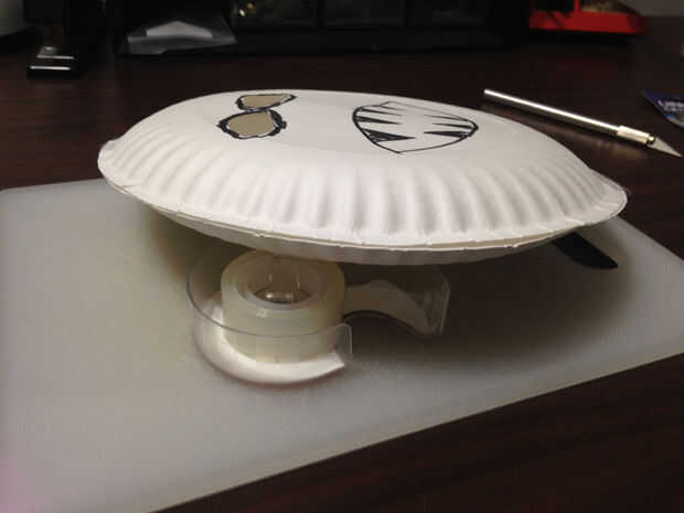 Una vez que tengas los ojos recortados volteen la placa. Resalte alrededor de los orificios de ojos con el marcador negro, esto hará que los destacan. Dibuje una boca mirada de miedo. A continuación tome la segunda placa y tanto la cinta como se muestra en la foto. Usted realmente sólo necesita un trozo de cinta en la parte inferior y en la parte superior de las placas, vas alrededor de todo el camino no es necesario. Finalmente utilice el marcador para dibujar a las pupilas a través de la placa superior sobre la placa inferior.