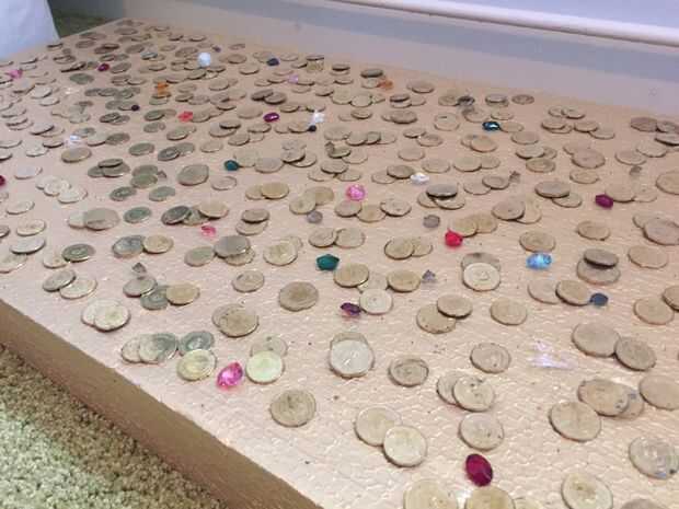 De miembros de la familia que estaba trabajando en este proyecto cool, tengo un balde de monedas antiguas y desgastados cristales de Swarovski. Algunos de los cristales utilizados como un blindaje en la parte superior del LED (que les da un brillo impresionante). Algunos que utilizado en el exterior del pecho para la decoración junto con algunos soldados transistores. El resto pegado a un bloque de espuma de poliestireno grande que he pintado en oro. Este bloque se puede poner en el pecho de un compartimento oculto con' '.