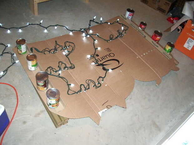 Inserte las luces de Navidad en los agujeros. Otra vez sugieren fuertemente las luces LED, no te calientes, que es importante porque estos materiales son muy inflamables. Habrá algunas luces que cuelgan detrás de la cartulina entre los conjuntos de ojos, pero esto es bueno, crea un 'Halo' alrededor de la forma de la cabeza.