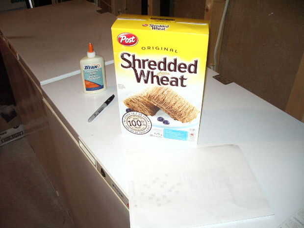 Dibujar formas de ojo en la parte frontal de la caja de cereal. Corte la forma con un cuchillo afilado.