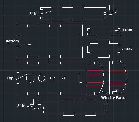 Nota: usted puede grabar un diseño en los lados o la parte superior del bosquejo colocando el gráfico en la cara el sketch en un programa de dibujo. Si haces esto, colocar el gráfico en cada pieza lateral para que al construir el silbato, el gráfico señala siempre hacia el exterior.
