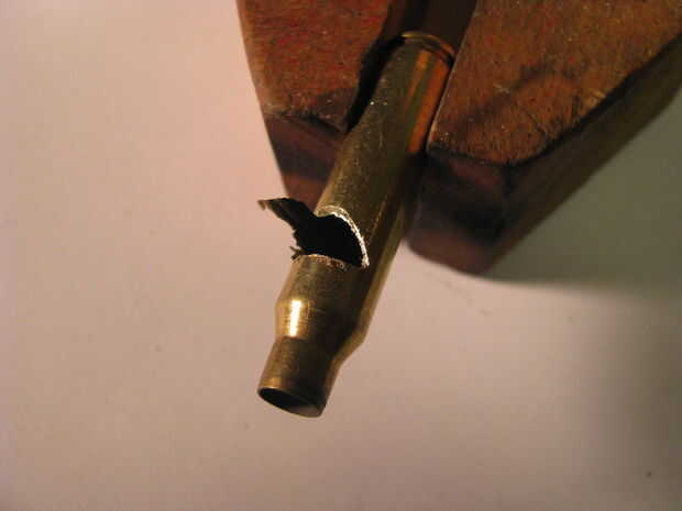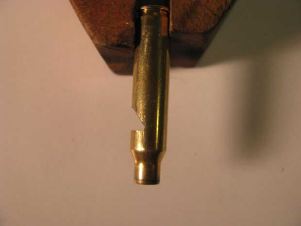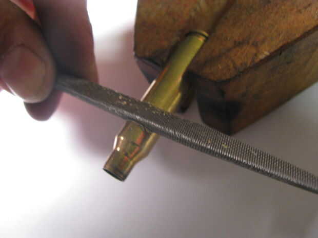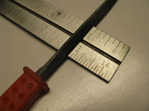 Utilizando un ¼" triángulo archivo, una muesca ¼" hacia abajo desde la línea de forma cónica en la cáscara. Asegúrese de mantener a la vanguardia del archivo a 90 grados. Ver las fotos. Seguir presentando hasta que el borde de la ruta del archivo quede al ras con la pared de la cáscara.