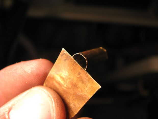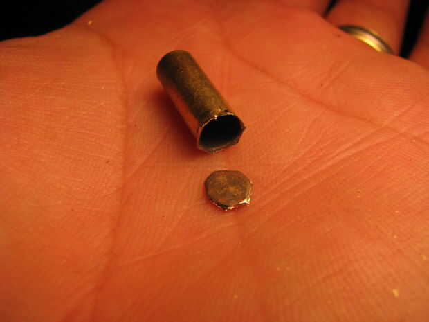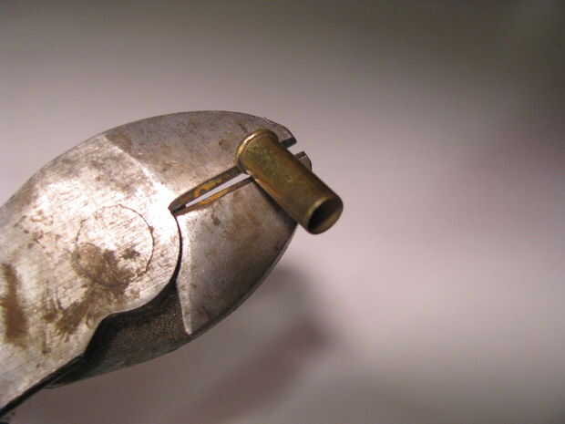 Use un par de pinzas de corte diagonal para quitar el lado de la cartilla de la.22 shell. Luego tome un pedazo de chatarra de latón desde otro shell y soldadura a la mitad sobre el lado del negocio de shell. Ver las fotos.