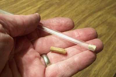 Inserte el pedazo corto para tapar el extremo posterior del silba. La pieza más larga en el otro extremo del silbato tendrá una pieza plana lija o rebanado sobre él con un cuchillo. Este plano quita solamente cerca de 1mm de espesor de superficie de la espiga. En muchos silbidos este plano pendientes hacia arriba para que sea más estrecho en la muesca "V" en la parte superior el silbato.